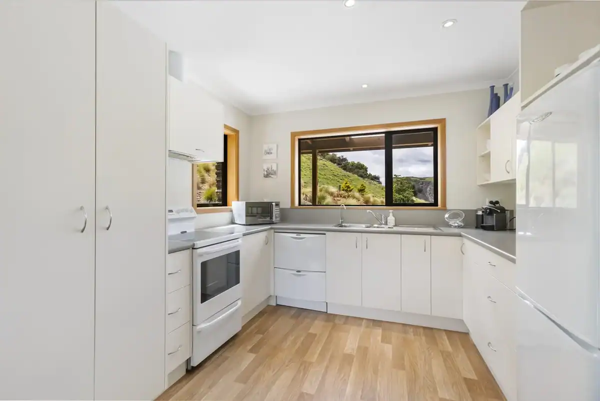 Modern kitchen with white cabinets and large windows overlooking scenic hills, ideal for a vacation rental at Judge & Jury Village. Perfect for relaxing and enjoying nature.